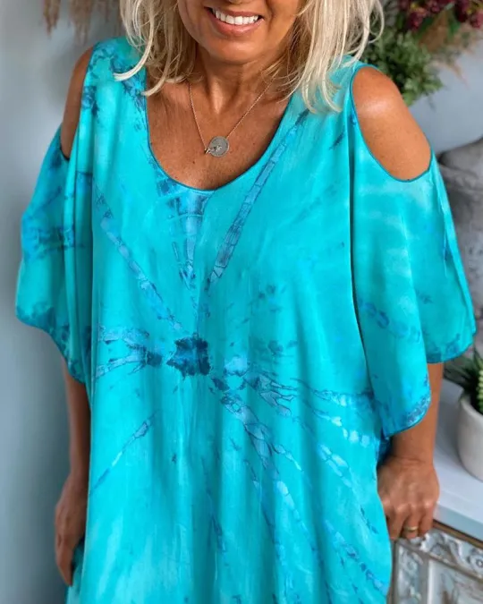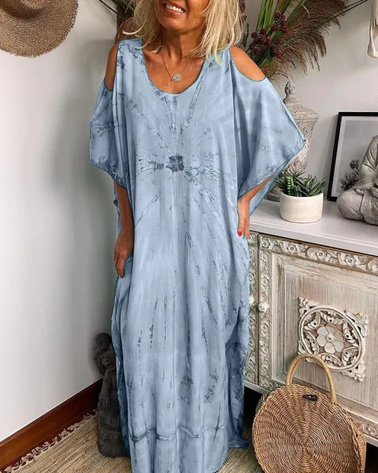 Tie-Dye Print Cold-Shoulder Loose Maxi Dress(4 Colors)